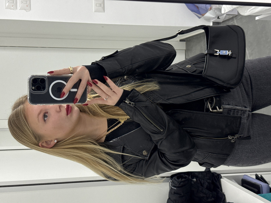 A woman takes a selfie wearing a black leather jacket, black shirt, and gray jeans. A black purse hangs on her shoulder. She is wearing gold jewelry, including rings and a necklace. The background includes white walls with electrical outlets, and a corner of a room with some items on a white shelf. Her phone has a transparent case with a MagSafe ring. Her nails are painted a dark red color.