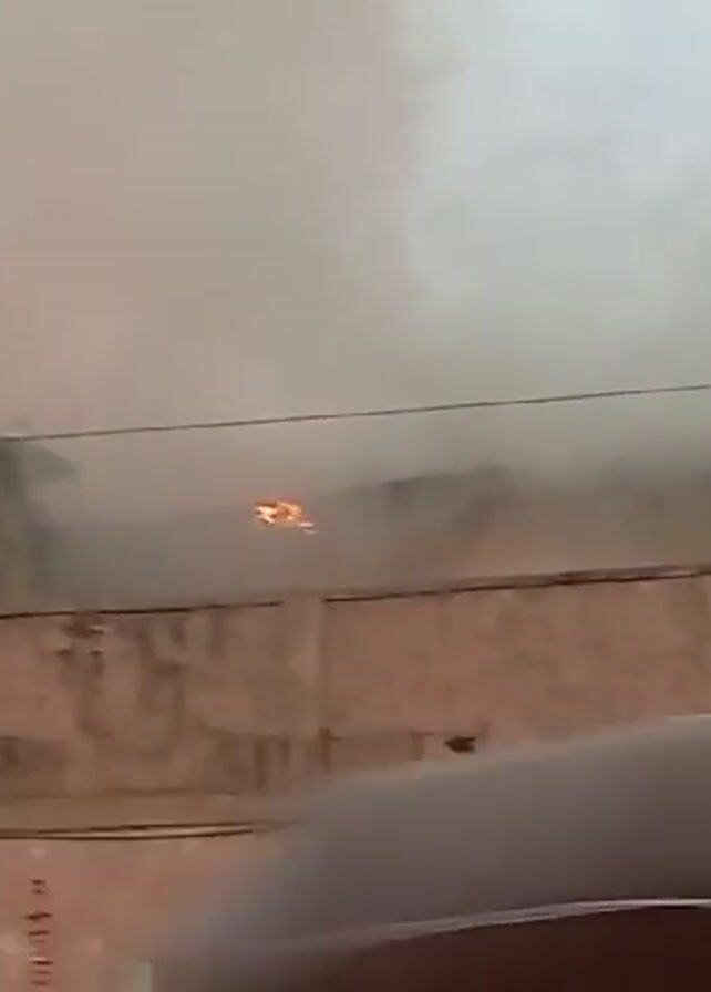 building on fire. Thick, grey smoke billows from the rooftop, partially obscuring the structure. Flames are visible in one section. The building is painted a light reddish-brown and has barred windows. A person walks in the foreground carrying a box or package on their head. Other people stand and watch the fire. Cars can be seen blurred in the foreground. The sky is overcast, and the environment appears urban.