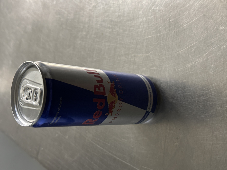 A single Red Bull energy drink can stands upright on a metallic surface, located in the city of Slivnitsa, Bulgaria