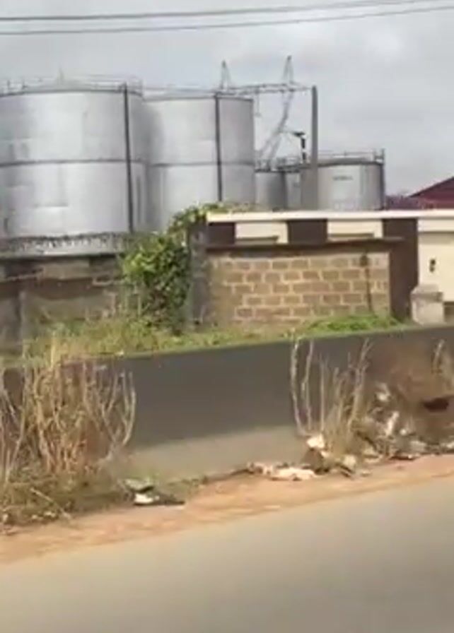 view from a moving vehicle driving past a facility with large silver cylindrical tanks