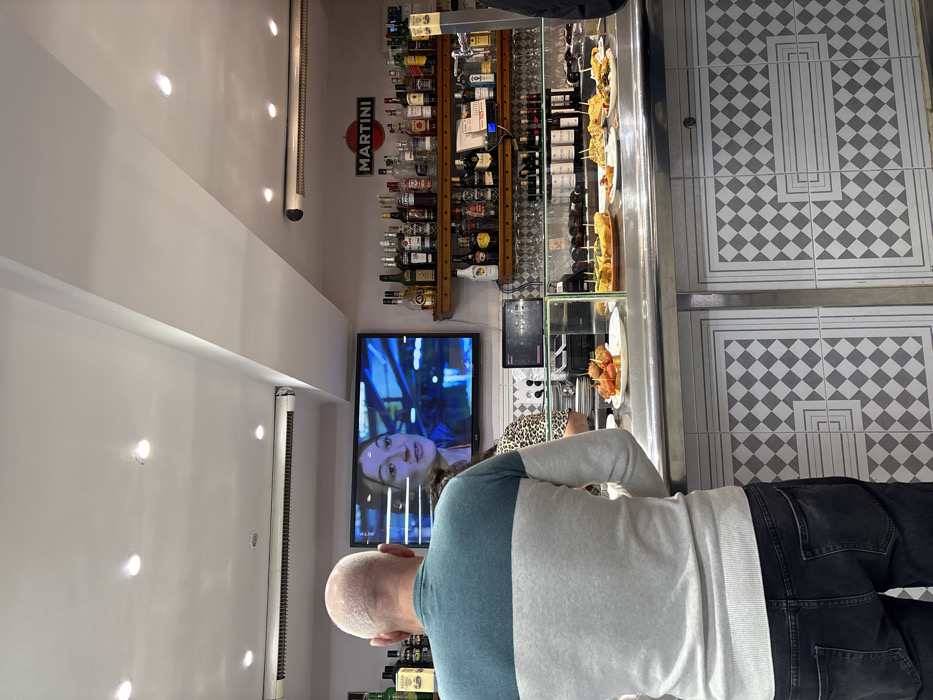 Inside a bar, a man in a two-toned sweater and dark jeans stands near the counter. Behind the counter, shelves are stocked with bottles and various snacks on skewers. A television screen displays a woman's face. Decorative lights dot the wall, and a Martini sign is visible above the bar. The tiled floor features a gray and white geometric pattern.