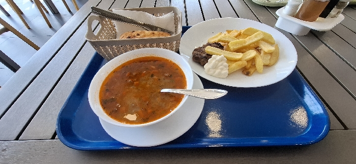 A blue rectangular serving tray rests on a light grey slatted table in an indoor dining area, presumably in Novi han, Bulgaria. The tray holds a white bowl containing a reddish-orange soup, with a silver spoon partially submerged. Adjacent to the bowl, a white oval plate presents a portion of golden-brown french fries, a dark brown grilled patty, and a dollop of white sauce. A light brown woven basket contains two bread rolls and a white napkin with silver tongs. In the upper right, a white condiment holder with a salt shaker and a dark bottle is visible. Partially obscured wooden chairs are present in the background. The scene depicts a prepared meal.