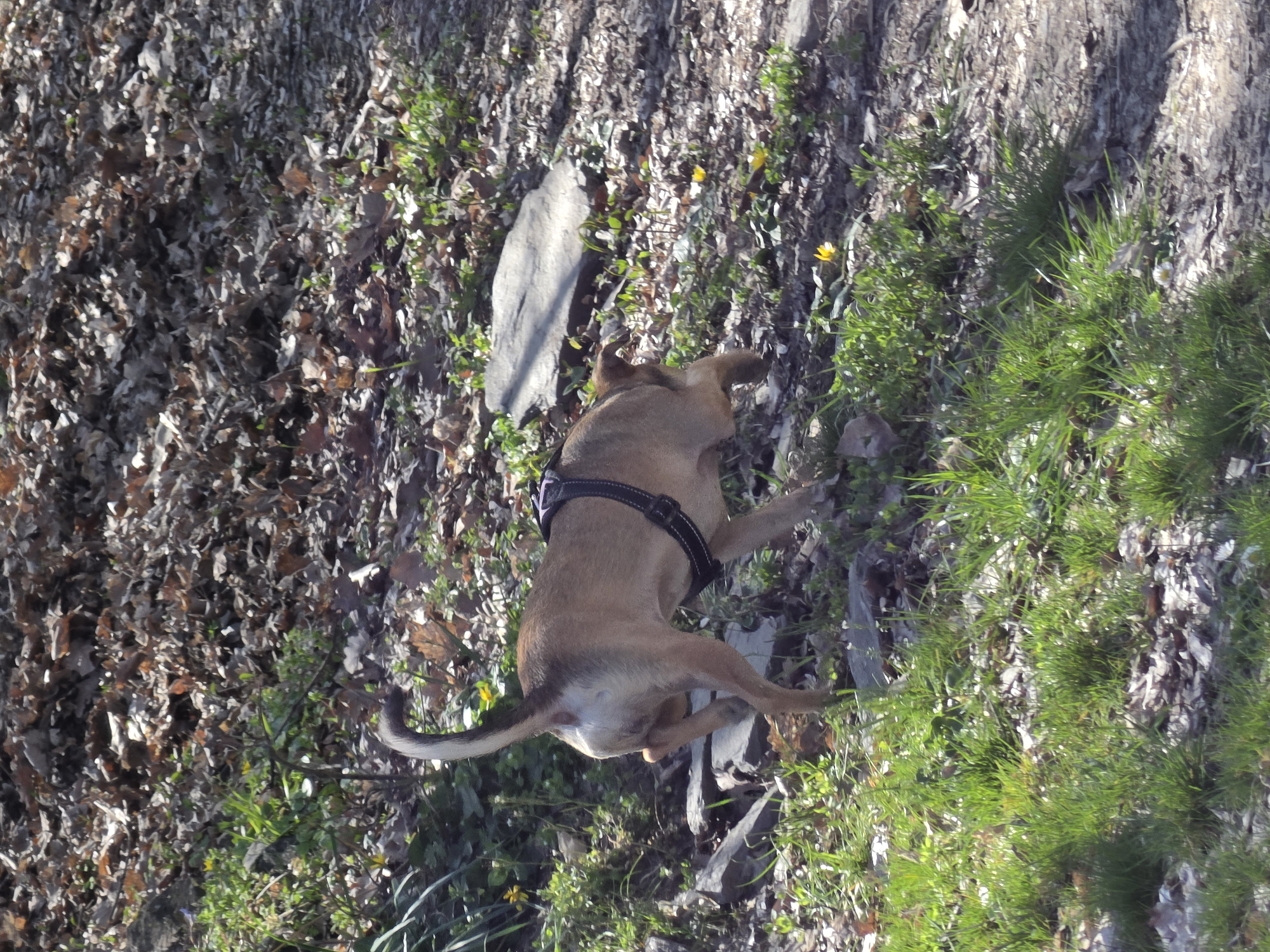 - "A medium-sized, light-brown dog wearing a black harness is standing in a grassy, wooded area" by FM-wXYGZ2, licensed under CC BY 4.0