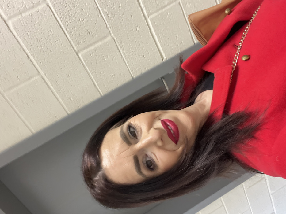 female subject taking a selfie indoors. The subject has dark brown, shoulder-length hair and is smiling at the camera, wearing red lipstick and eye makeup. She is dressed in a bright red coat with gold-colored buttons and a gold chain detail, worn over a black garment. A light brown bag is partially visible on her right side. The background consists of a smooth, dark grey vertical surface on the left and a light-colored brick or concrete block wall on the right. There are no discernible elements within the image to specify the exact location in Mensdorf, Luxembourg.