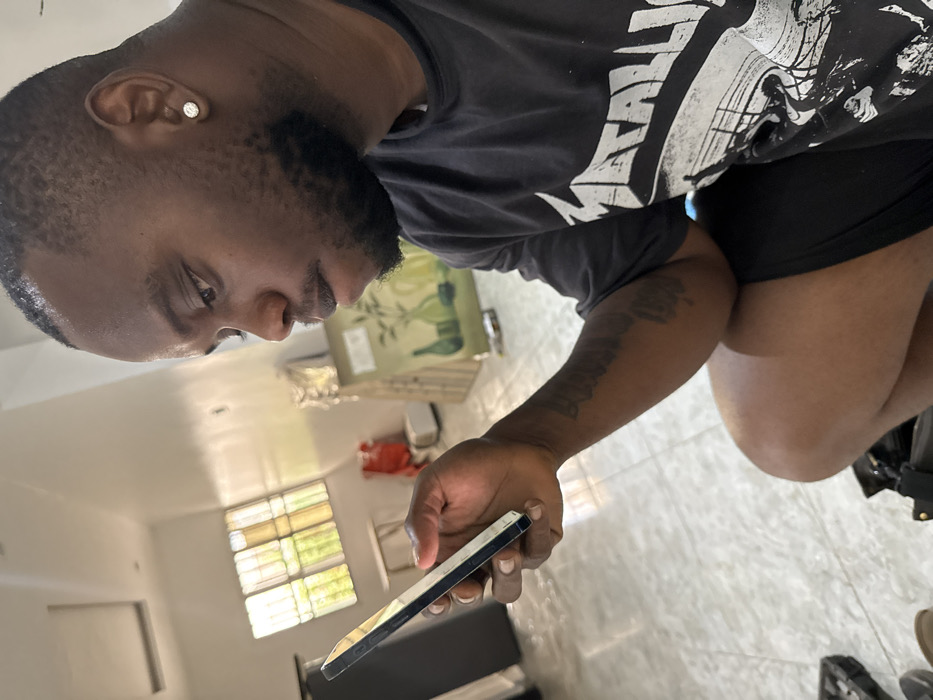 An adult dark-skinned male is depicted in a crouching position within an indoor setting in Iddo Tudunwada, Nigeria. He is observed in profile, facing slightly right from the viewer's perspective, with his gaze directed downwards at a silver-edged smartphone held in his left hand. The male has short dark hair and a trimmed beard. He wears a dark t-shirt with a white "METALLICA" graphic print and dark shorts. A single silver-colored stud earring is present in his right earlobe, and tattoos are visible on his left forearm. The background features light-colored walls and a light-toned tiled floor. Natural light enters the room through a window with a grid pattern, positioned on the left side of the frame. Visible objects in the mid-ground include a small, light-colored table, a red bag, a white box, and a framed painting depicting green bottles and foliage, leaning against a wall. The room appears sparsely furnished.