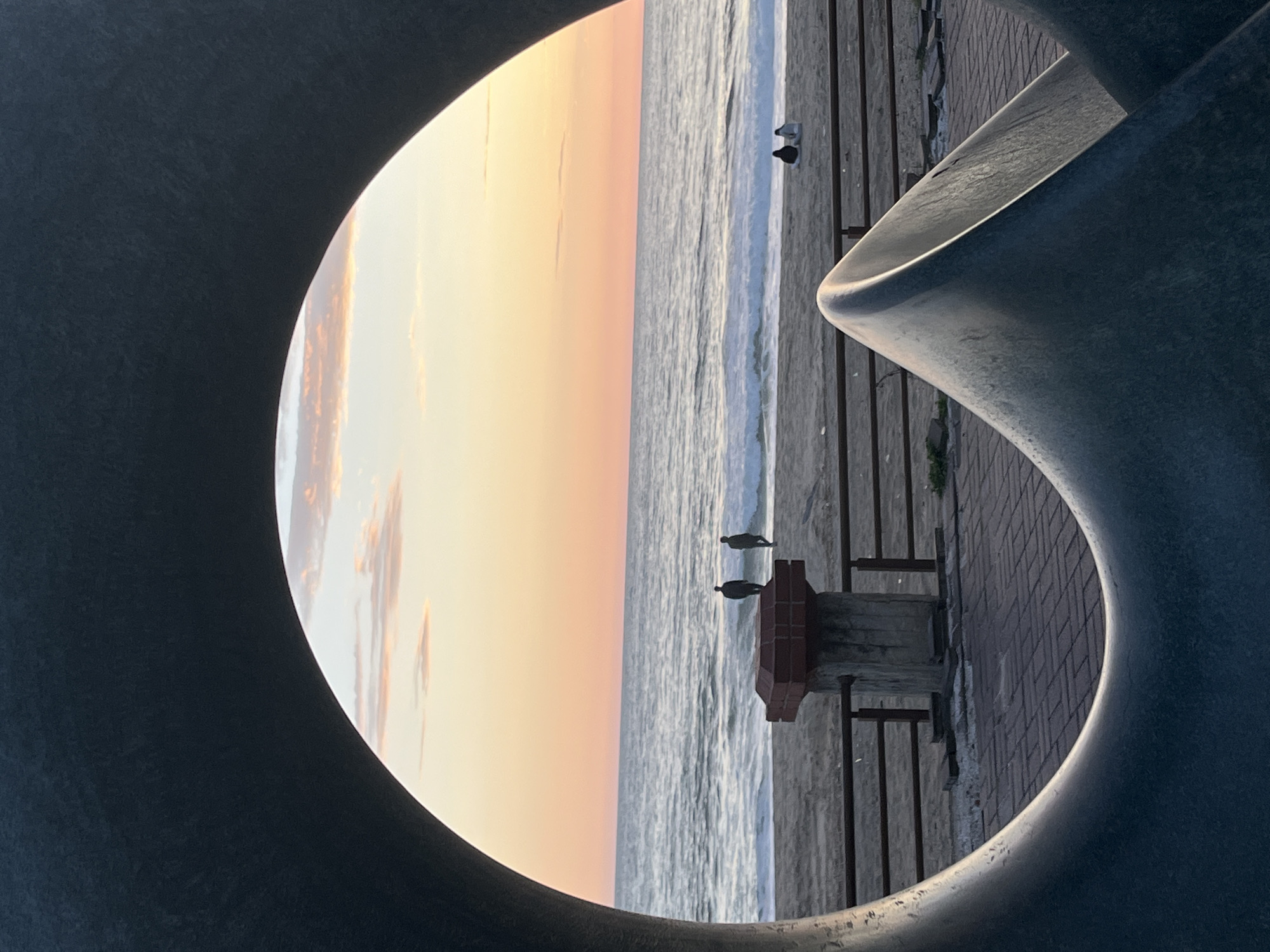 The image depicts a view of the Mediterranean Sea in Alanya, Turkey, framed by a sculpture of a curved pipe. The sunset casts a gradient of yellow and orange across the sky, reflecting on the water. Two birds stand on a brick structure along the shore, and two more perch on a nearby railing. The ground is paved with a brick pattern. The sculpture dominates the foreground, obscuring portions of the scene.