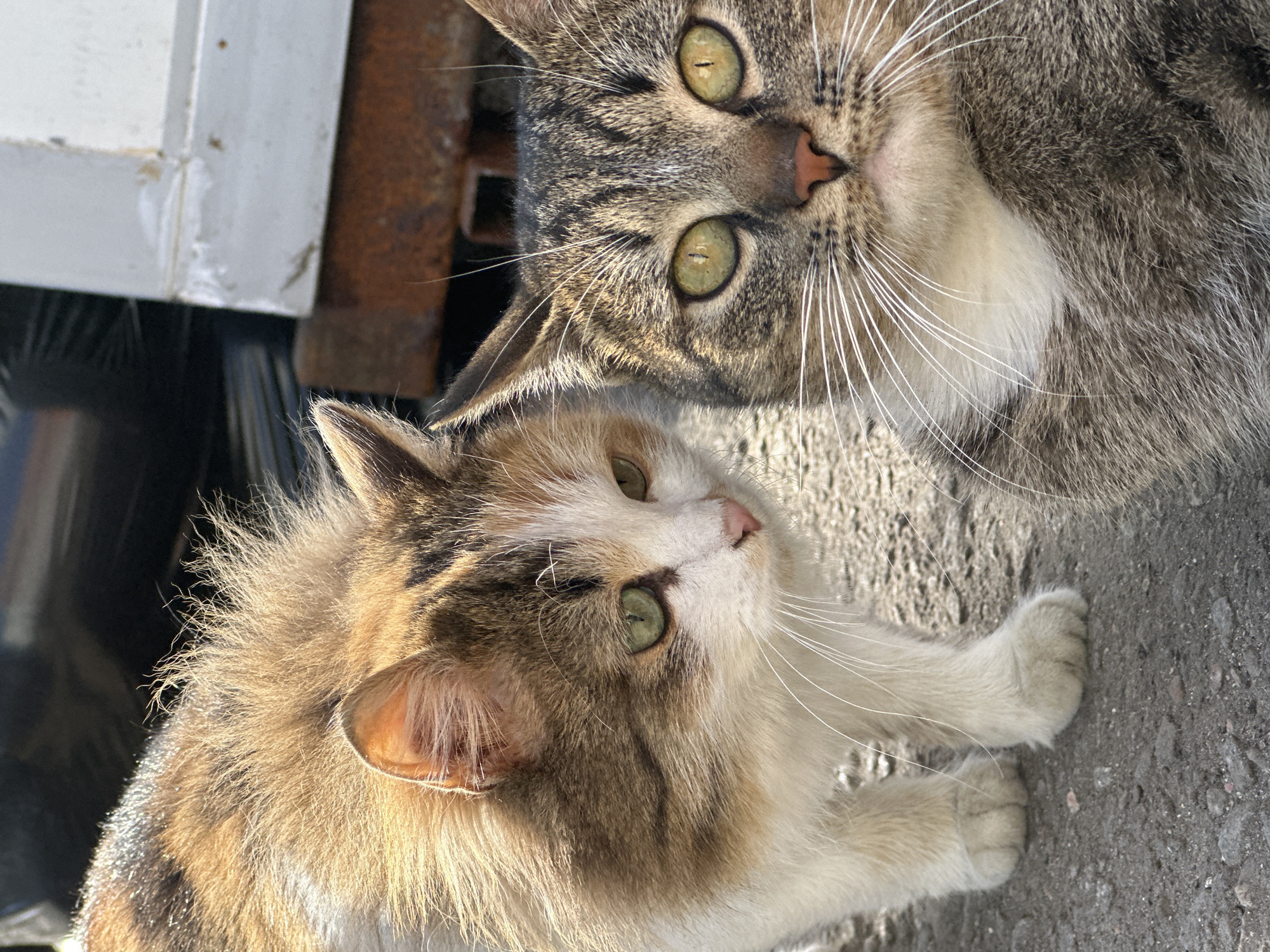 Two cats are close together in посёлок опытного хозяйства «Ермолино», Russia. The larger cat, located in the upper right of the frame, is a tabby with green eyes and white whiskers. The smaller cat, positioned below and to the left, has a calico pattern with a mix of white, brown, and black fur, also with green eyes. The background includes a section of a white painted object, possibly a building or vehicle, along with some rusted metal. The cats are positioned on a grey surface that appears to be concrete or asphalt.