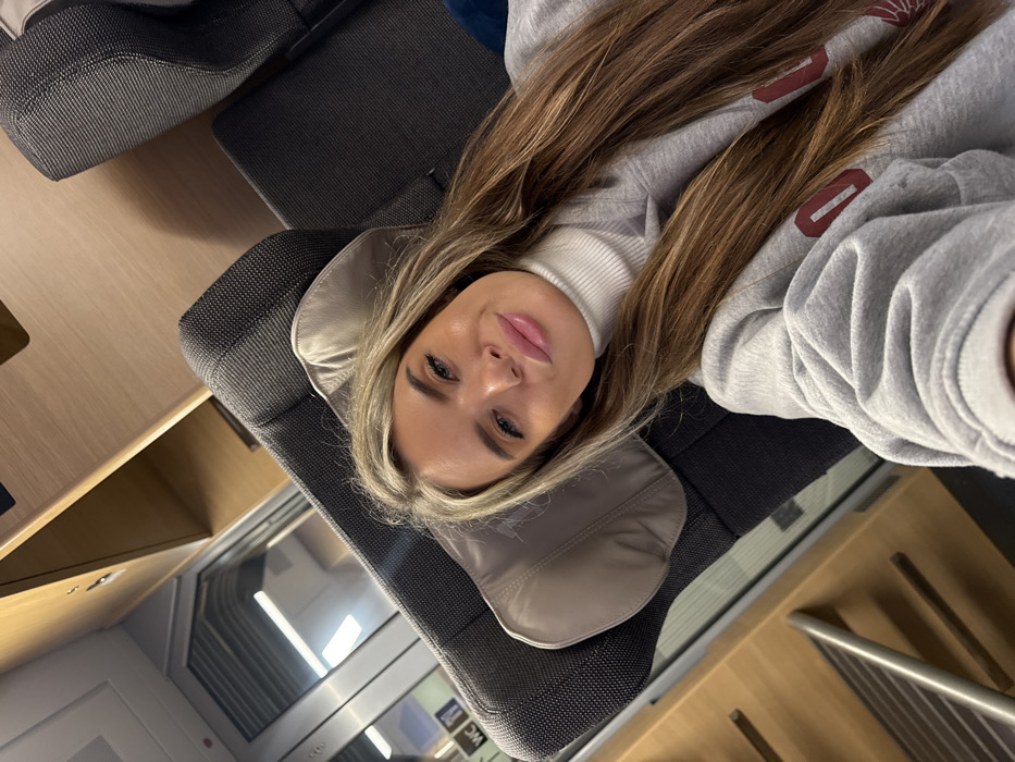 A female individual with long, straight light brown and blonde hair, blue eyes, and prominent lips is depicted in a self-portrait. She is wearing a white ribbed turtleneck beneath a grey hooded sweatshirt with a partial dark red graphic on the chest. The individual is seated upright in a modern train seat, which is upholstered in textured grey fabric and features a lighter beige headrest. The background reveals the interior of a train carriage, characterized by light wooden paneling on walls and overhead compartments, alongside large windows showing a blurred exterior. To the left, a "WC" sign with male and female pictograms is clearly visible on a wall, indicating a restroom facility within the carriage. Other similar grey train seats are partially visible, along with metallic fixtures. The scene is illuminated by artificial interior lighting, consistent with a passenger train operating near or within Amsterdam, Netherlands.