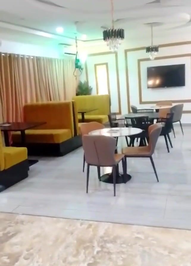 n interior view of a restaurant. The space is decorated with cream-colored walls framed with gold trim. There are several tables and chairs arranged throughout the room. Some tables have black chairs, while others have brown chairs. A large gold-colored curtain is visible on one side of the room, and there are several upholstered booths with small tables. Chandeliers hang from the ceiling, and there are two flat-screen TVs mounted on the walls. The floor is covered in light-colored tile. The room is well-lit with overhead lighting. There are some plants. No people are seen in the video.