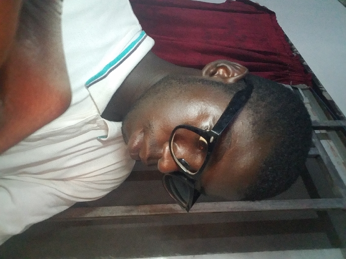 A person with dark skin lies on their side. They wear a white collared shirt with blue trim. Black-rimmed glasses perch on their head, partially obscuring their face. Their skin appears slightly oily. A red curtain is visible in the upper right corner. The person seems to be on a metal frame. The image is rotated, giving a tilted perspective.