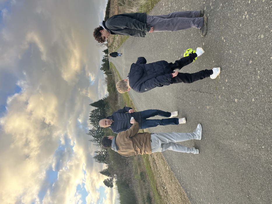 The scene is set on an asphalt road in Macedo de Cavaleiros, Portugal, under a partly cloudy sky with patches of blue and sunlit clouds. The road, flanked by sparse dry vegetation and ascending towards the distance, is bordered by a line of evergreen trees in the background. In the foreground, four individuals are present. On the far left, an adult male in a brown jacket, grey hoodie, and grey sweatpants extends his left hand, holding a small white object, towards a bald adult male in a dark blue puffer jacket and jeans, who is simultaneously extending his right hand towards the object, suggesting an exchange. To their right, a young male in a dark puffer jacket and black pants is positioned with his right foot near a neon yellow and black soccer ball, appearing to dribble or kick it. Adjacent to him, a teenage male in a dark jacket and grey pants stands with his hands in his pockets, observing the activity. Further up the road in the midground, a fifth individual in dark clothing walks away from the viewer.