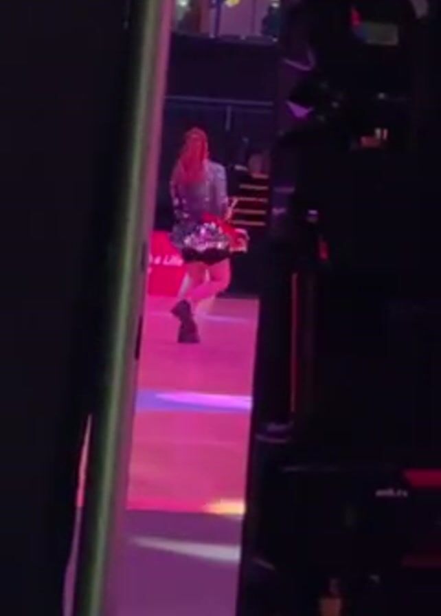 A woman with red hair walks across a brightly lit floor in a theatre-like space. She wears a sequined top, shorts, and black shoes, and carries something. The camera view is partially obstructed by dark equipment, possibly stage lighting or speakers. The floor is segmented into different colored sections: red, blue, and purple. Background elements suggest a multi-story structure with decorative elements. There is indistinct writing or branding on a surface in the background. The woman is walking away from the camera.