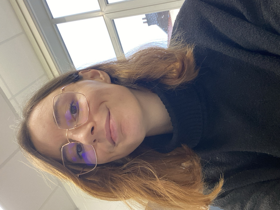 The image depicts a young adult female in a headshot, facing the camera directly. She possesses medium-length, wavy, reddish-brown hair and fair skin. She wears square-framed, thin gold-colored eyeglasses. Her light-colored eyes exhibit reflections from internal, rectangular light sources, likely overhead illumination. A subtle, closed-mouth smile is present. She is dressed in a black, high-neck sweater. The background reveals an indoor setting with a white, textured ceiling visible in the upper left. To the right, a multi-paned window with a white frame offers an exterior view of an urban landscape in Lille, France. Through the window, a building with a reddish-brown tiled roof is discernible, partially covered by white snow or frost. A chimney stack, similarly coated in white, rises from the roof. The sky beyond is bright and overcast, indicating daytime winter conditions.