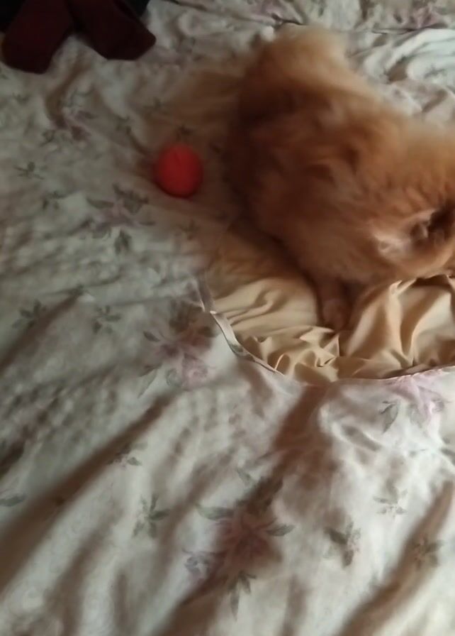 small, fluffy, light-brown Pomeranian dog on a bed. The bed has a light-colored floral patterned sheet, and a tan-colored sheet underneath. There are pillows visible at the head of the bed. A small, red ball lies near the dog. The dog initially seems to be spinning and rustling the sheets. It then settles down, sitting and looking around. It stands up briefly before the video ends.