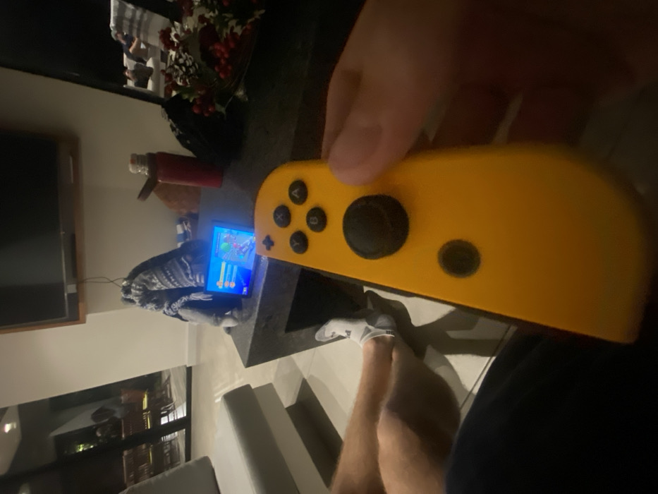 A person holds a yellow Nintendo Switch Joy-Con controller. A Nintendo Switch screen displays a video game, with a gray, knitted object beside it. The setting appears to be a dimly lit living room, with a television mounted on the wall and a decorative plant. The individual is wearing dark clothing, with a partially visible foot wearing a white sock.