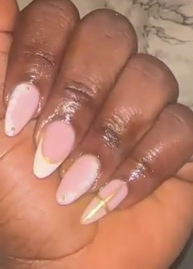 A close-up shot shows a dark-skinned hand with long, almond-shaped nails. The nails are decorated with a light pink base and white tips, adorned with gold accents and small gold studs. The fourth finger wears a large, ornate gold ring. The background is a marble-patterned surface and a dark, indistinct area. The hand moves slightly, displaying the nails and ring.