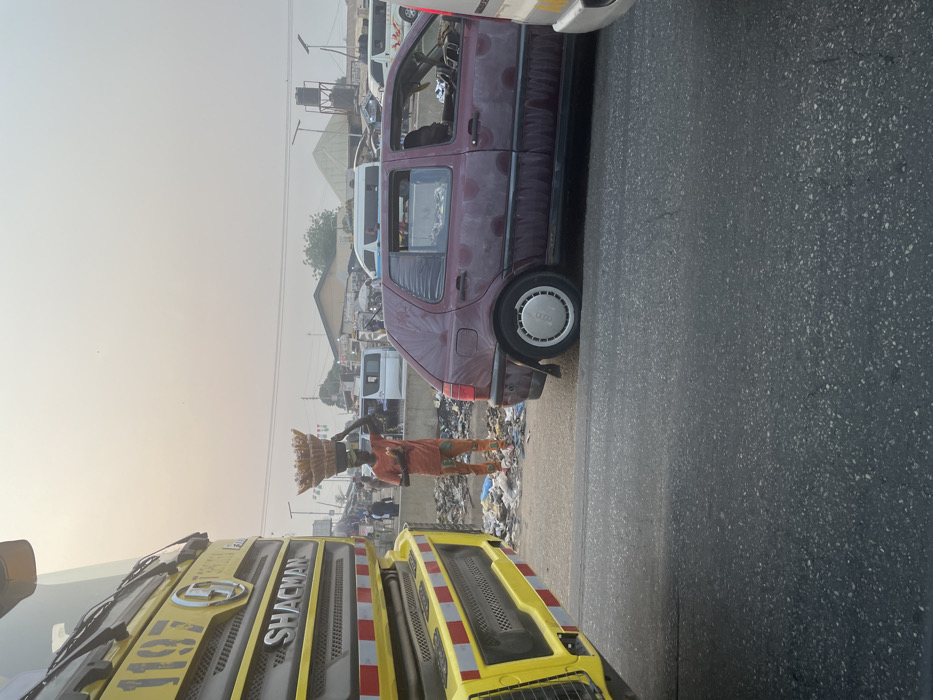 A man in orange stands near a pile of trash on the roadside, balancing a large basket on his head. A maroon car with an Audi-branded hubcap is parked nearby. A yellow Shacman truck is also present, partially obscuring the view of the man. In the background, buildings and various white vehicles are visible under a hazy sky. The scene appears to be a busy roadside market or gathering.
