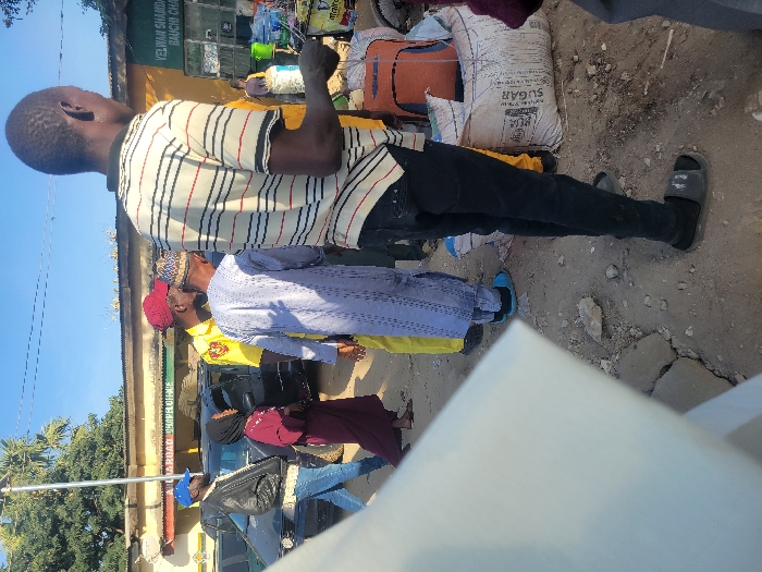 The scene depicts an outdoor urban environment, likely a street or market, in Bauchi, Nigeria, under clear daylight