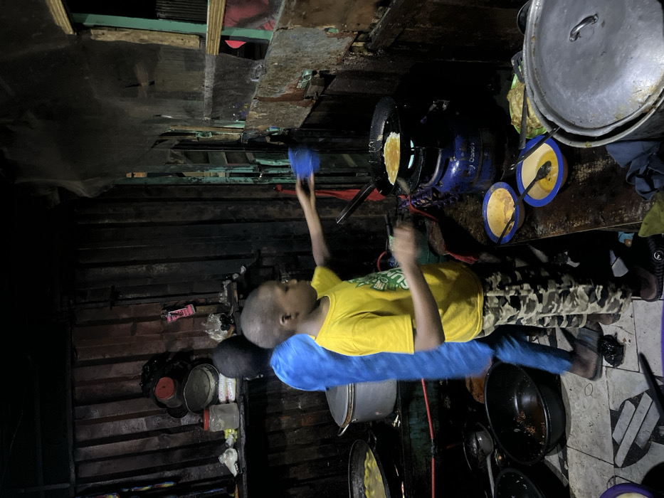 A young boy in a yellow shirt cooks in a cramped kitchen. He holds a blue object over a pan on a gas stove. Adjacent to the stove are bowls with yellow contents and cooking utensils. Large pots sit on a counter. The kitchen's walls are constructed from wood planks, and an array of pots and pans hang nearby. He is wearing camouflage pants and sandals.