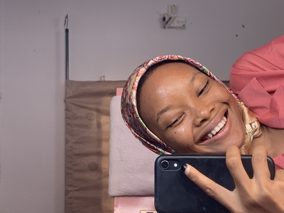 A female subject is captured in a close-up selfie, visible from the mid-chest. She has light brown skin, her eyes are closed, and she displays a wide, open-mouthed smile. She wears a multi-colored headscarf featuring a paisley-like pattern in shades of red, green, and gold, and a salmon-colored collared garment. Her left hand, with dark fingernail polish, holds a black smartphone horizontally, positioned for a selfie. The background, consistent with an indoor setting, features a light brown patterned curtain suspended from a dark rod. Below the curtain, a light pink surface supports a folded white towel. To the right, a white wall is visible, from which a dark horizontal rod extends, and a white electrical fixture with visible wiring components is present. The image itself provides no distinct visual markers to confirm the stated location as Ilorin, Nigeria.