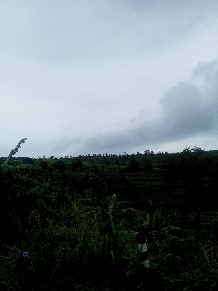 The image depicts a rural landscape in Babaliya Mal., India, under an overcast sky. The upper two-thirds of the frame are dominated by a light grey sky, transitioning to darker grey clouds on the right side. The lower third features dense, dark green foliage, including broad-leafed plants, tall grasses, and a distinct partially torn banana leaf on the far left. A single small purple flower with a yellow center is visible in the bottom-left quadrant, partially obscured by leaves. Towards the bottom right, a white and black striped cylindrical marker emerges from the vegetation. The midground presents undulating hills covered in dark green trees and what appear to be terraced agricultural fields, though specific crops are indistinguishable. The horizon is marked by a silhouette of trees against the overcast sky. No discernible individuals or specific actions are visible within the scene. The lighting is diffused, indicating an overcast or low-light condition.