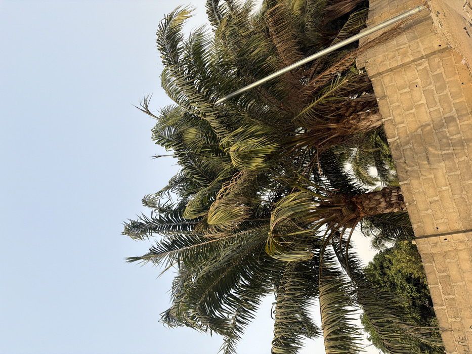 A low-angle shot showcases a tall palm tree against a pale blue sky. Its feathery green and brown fronds extend outwards. Adjacent to the tree is a brick wall, casting the overall composition in warm tones. A metal pipe diagonally cuts across the top of the image, partially obscuring the tree's foliage. A glimpse of another green tree is seen behind the brick wall.