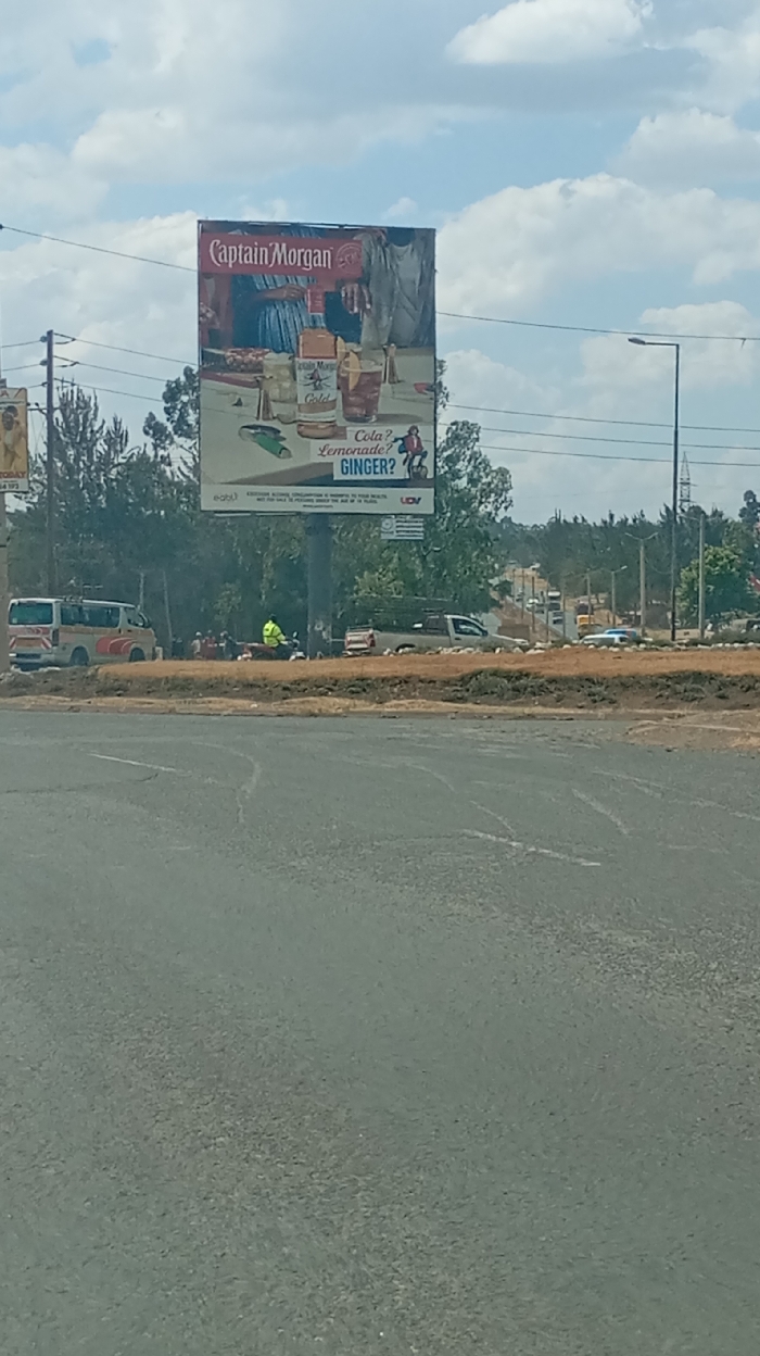 A billboard advertising Captain Morgan rum stands next to a road