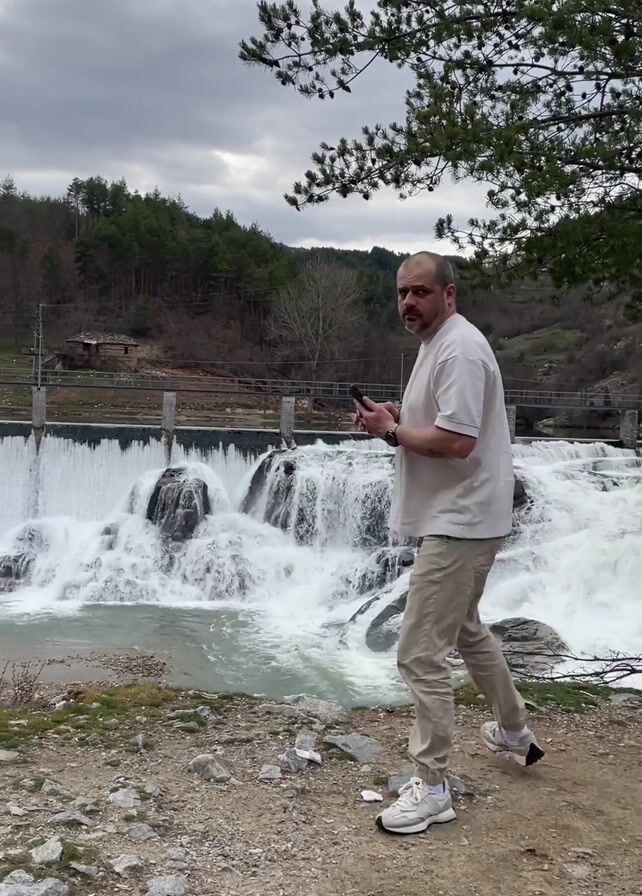 A man stands by a waterfall on a cloudy day. He turns and walks slightly while looking at his phone and smiling. He wears a light-colored t-shirt, light brown pants, and white sneakers. The waterfall is over a dam, and there's a forest and some buildings in the background. The ground he stands on is rocky. A tree is to his right.