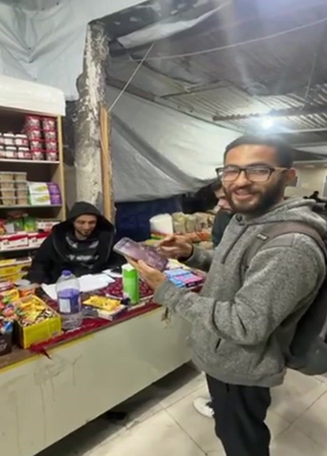 Two men are visible in the video. One man is standing in front of a shop counter, holding up a package and smiling at the camera. He is wearing glasses, a gray hooded sweatshirt, a dark backpack, and tan sneakers with black stripes. The other man is seated behind the counter, writing on a piece of paper. He is wearing a black hooded jacket. The counter is covered with various items, including snacks, candy, and drinks. Behind the counter is a shelf stocked with more snacks and packaged goods. The setting appears to be a small, indoor market or shop with a slightly cluttered and worn appearance. There is a tarp-like material partially covering the ceiling. The man in the gray sweatshirt appears to be making a purchase.
