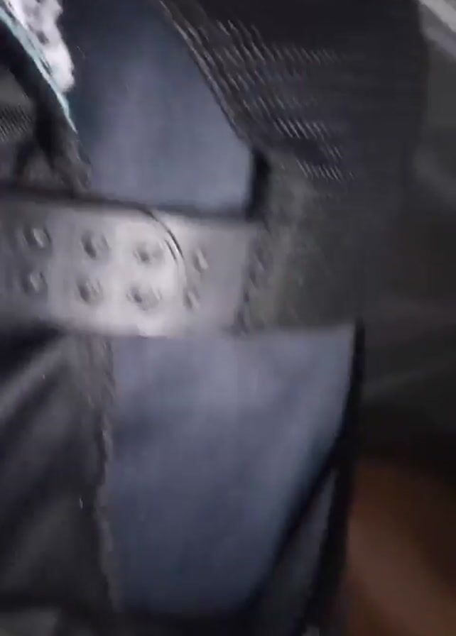 pair of glasses being placed on top of a dark-colored hat. The hat is then placed on top of a pair of dark-colored pants. A white, mesh-like material is in the background. The camera angle is close-up and slightly above, focusing on the items being stacked.