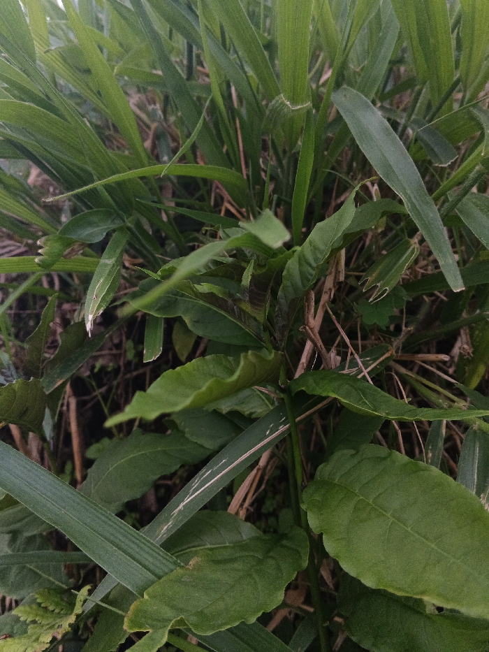 The image displays a dense patch of ground vegetation in Khna, Cambodia, captured from a slightly downward angle. The scene is dominated by various forms of green plant life. Numerous long, slender blades of grass, some exhibiting faint parallel venation and occasional pale longitudinal streaks or minor damage, extend vertically and diagonally. Interspersed among the grass are several broad-leaved plants with darker green, oval-to-elongated leaves, some showing a slightly corrugated or wavy texture. A few smaller, newer leaves display a reddish-purple coloration. Dry, light brown plant stalks and stems are visible throughout the lower and mid-sections, intertwined with the green foliage. No individuals, animals, or man-made objects are present. The lighting appears natural and diffuse.