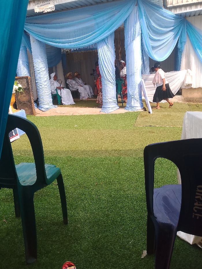 The image portrays an outdoor event setting in Ufuma, Nigeria. The ground is covered with artificial green turf. A temporary canopy structure dominates the background, featuring light blue fabric drapes and supporting columns also wrapped in light blue material. A metal sign, "FIRST EXPRESS ALUMINIUM," is visible at the top left of the structure. Underneath the canopy, on the left side, three women are seated on plastic chairs. They are dressed in white traditional attire, including headwraps. To their left, a large, dark speaker with a small white floral arrangement is positioned. In the center-right section of the canopy, a woman in a red patterned dress stands, and another individual is partially visible behind a blue-draped column. To the right of the sheltered area, a woman wearing a light-colored blouse and a dark skirt is captured mid-stride, walking from right to left across the artificial turf. She passes a white, upright sign board. A table draped with a white cloth is partially visible on the far right. In the foreground, a dark teal plastic chair occupies the lower left, and a dark blue plastic chair, marked with "GRACE" on its back, is present in the lower right. A single red sandal is visible at the bottom center of the frame.