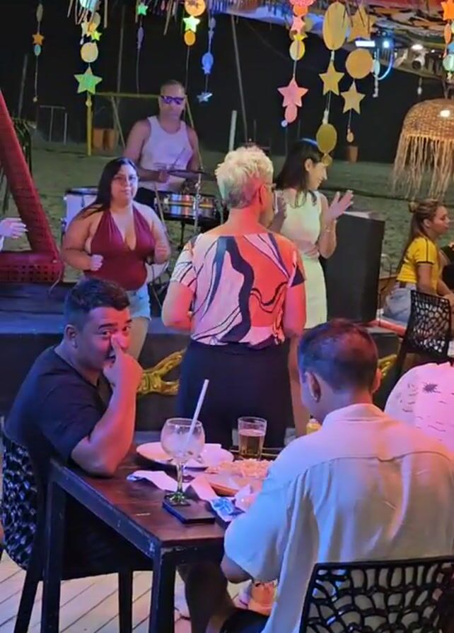 The video captures a lively outdoor scene, likely at a beach bar or restaurant