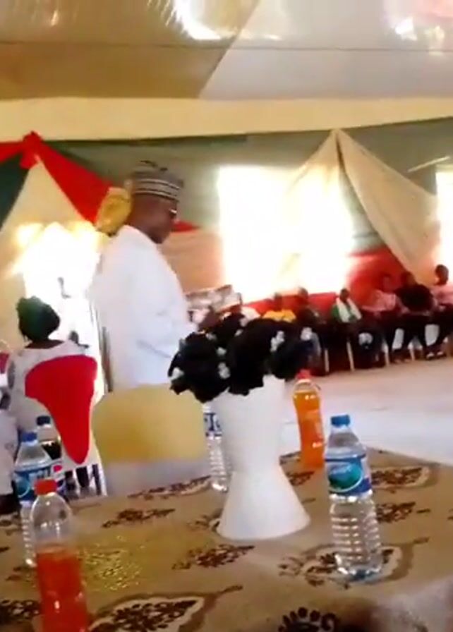 n indoor event with people seated and standing. A man in a white outfit and traditional hat is walking in front of a table. The table has drinks and decorations. There's an audience of people seated and standing around the room. The walls are decorated with draping cloth in colors of green, red, white, and orange. A stage is set up at the end of the room.
