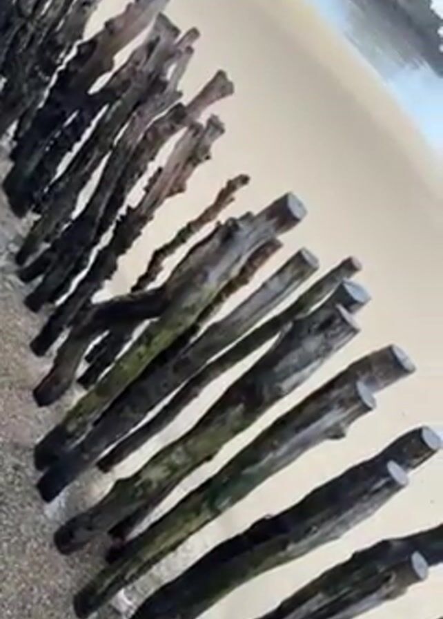 close-up of wooden poles embedded in a sandy beach. The poles appear weathered, with some covered in moss or algae. Beyond the poles, there is a wide sandy beach and a body of water, possibly the ocean, with a cloudy sky above. The water appears calm with small waves. In the distance, a structure or landmass is visible. The video is shot from a low angle, emphasizing the poles in the foreground. The wind is blowing.