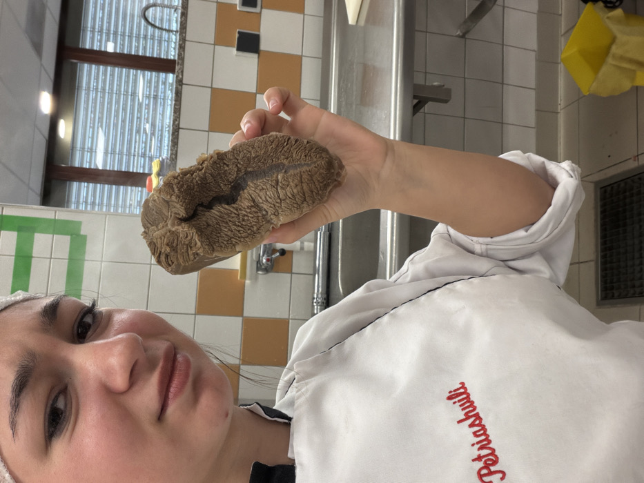 A young female, identified by the embroidered name "Petriashvili" on her white chef's jacket, is depicted in a professional kitchen environment located in Schiltigheim, France. She wears a white hairnet and looks towards the camera with a slight smirk. Her right hand holds a large, grayish-brown, textured object consistent with a cooked animal tongue, featuring a distinct central groove and pronounced papillae on its surface. The background consists of tiled walls with a pattern of white and light brown square tiles, a stainless steel countertop with integrated sinks and a faucet, and a window with horizontal blinds. A white cutting board is visible on the counter to the right. The floor shows a dark grid mat in the lower left and a yellow container with a white cloth in the lower right.
