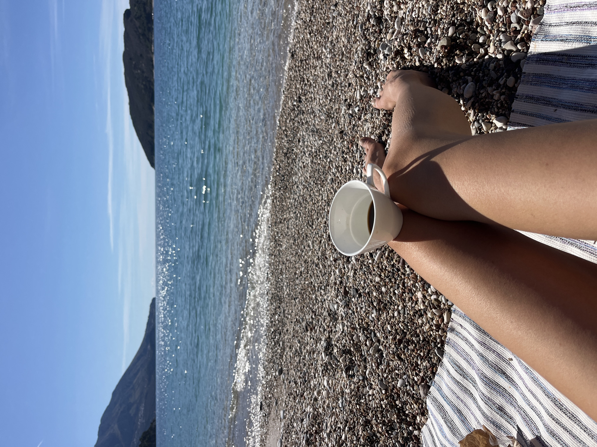A sunny beach scene shows a person lounging on a pebbled shore, likely near Budva, Montenegro, evident from the mountainous landscape in the background. A white coffee mug rests on their crossed legs, which are positioned atop a striped towel. The water is calm, reflecting sunlight, and gently laps at the shore. The sky is clear and blue.