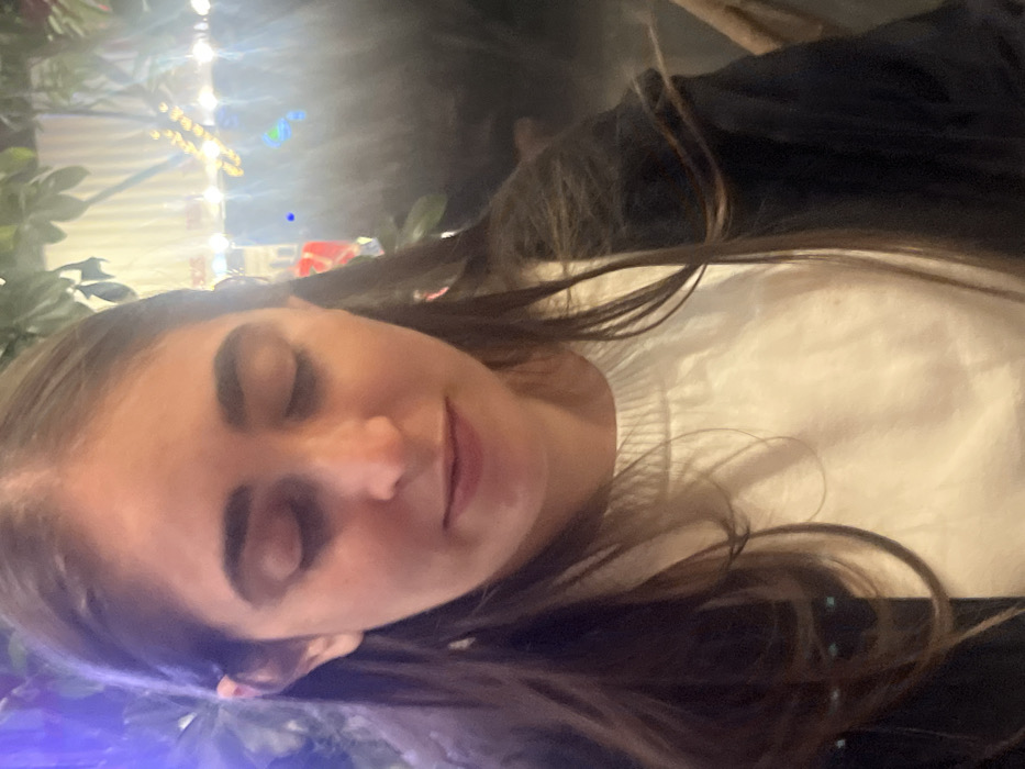 A young woman with long brown hair, wearing a white sweater and a black jacket, is captured with her eyes closed. She appears to be either sleeping or resting. Soft, diffuse lighting illuminates her face, highlighting her features. The background contains indistinct elements of greenery and string lights, suggesting an outdoor or semi-outdoor setting.