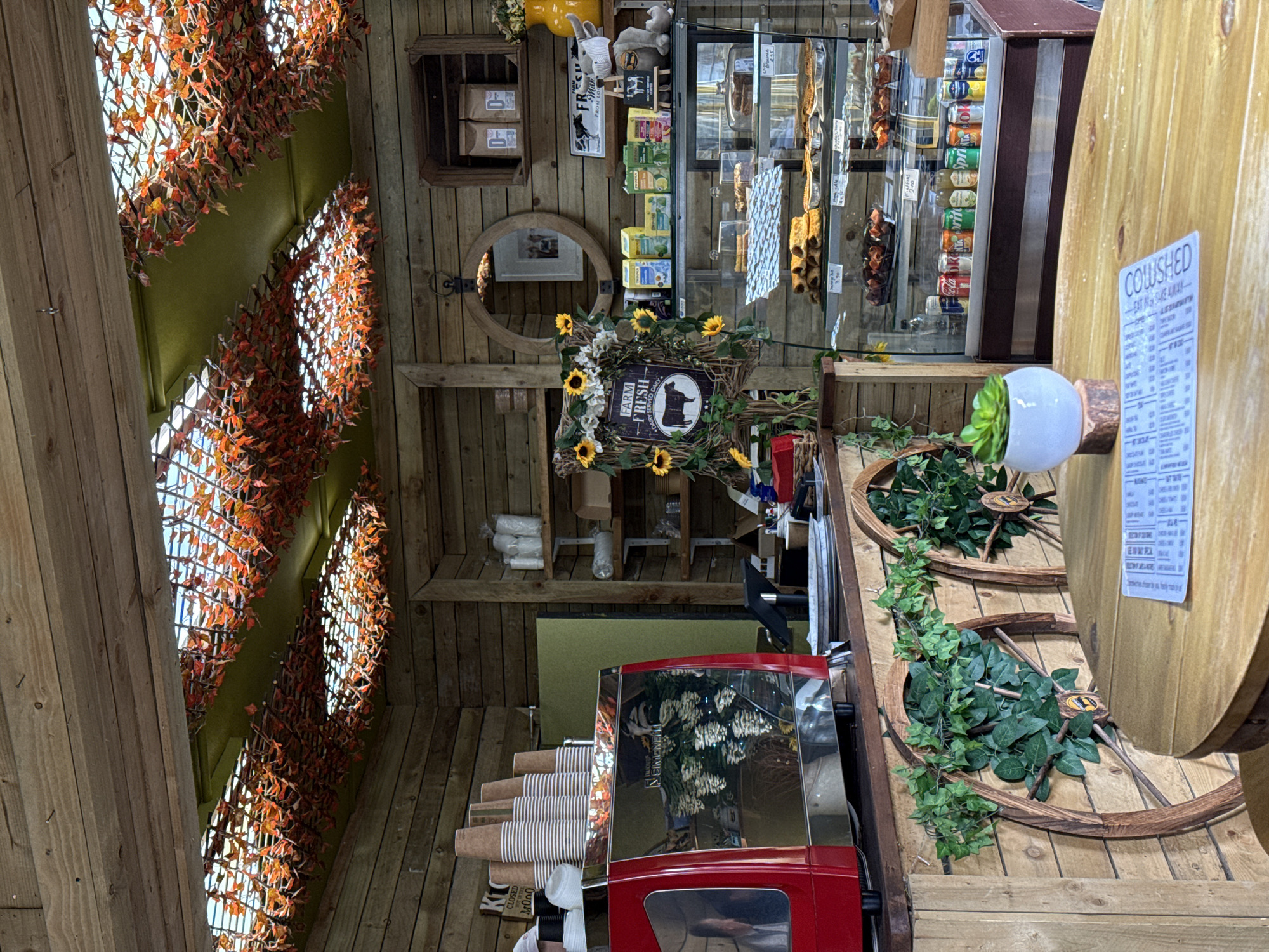 The image depicts the interior of a rustic-themed cafe or farm shop located in Windermere, United Kingdom. The establishment features walls and a counter constructed from horizontal wooden planks. The ceiling incorporates a grid structure adorned with artificial autumn leaves in red and orange hues, set against a green panel, suggesting decorative skylights or openings. On the left, a red and chrome Nuova Simonelli espresso machine sits on a wooden counter. Behind it, stacks of white and striped disposable coffee cups are arranged. A reflection of an individual, possibly a staff member, is visible in the chrome surface of the espresso machine. A partially obscured "CLOSED" sign is visible in the upper left. The main service counter and display area occupy the right side of the frame. A multi-tiered refrigerated glass display case showcases baked goods, including pastries and pies with visible price tags (e.g., "Sausage Roll £3.50," "Chicken & Ham Pie £4.95"). The lowest section of the display holds an assortment of canned and bottled beverages. Above the display, shelves hold various packaged teas (e.g., Twinings, Yorkshire Tea) and other retail items. A wooden crate containing two labeled brown bags ("D-O") is situated on an upper shelf. A circular wooden mirror hangs on the back wall, reflecting a framed picture. A prominent rustic wreath decorated with artificial sunflowers frames a "FARM FRESH" sign featuring a cow silhouette and the text "DAIRY SERVED DAILY." A yellow vase with dried flowers and a small plush toy are also present. In the foreground, a round, light-colored wooden table is positioned. A white menu, titled "COWSHED," is laid flat on the table. A small white pot containing a green succulent plant rests on a wooden block on the table. Artificial green ivy is wound around decorative wooden wagon wheels affixed to the lower section of the counter facing the table.