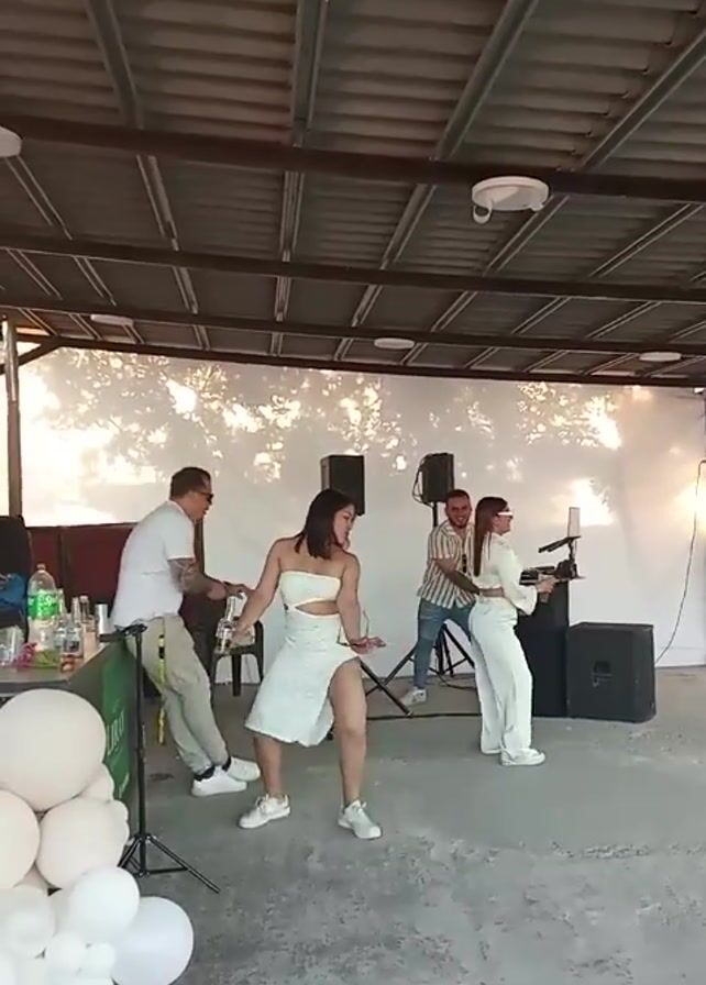 group of five people under a covered patio, dancing to music. There are two women in white, one wearing a two-piece dress and the other in a pantsuit. A man in a white t-shirt and khaki pants is dancing with them. Two other men are behind a DJ setup with speakers. There's a table with bottles and drinks to the left and a column of white balloons. The patio has a corrugated metal roof and a white wall behind the DJ setup.