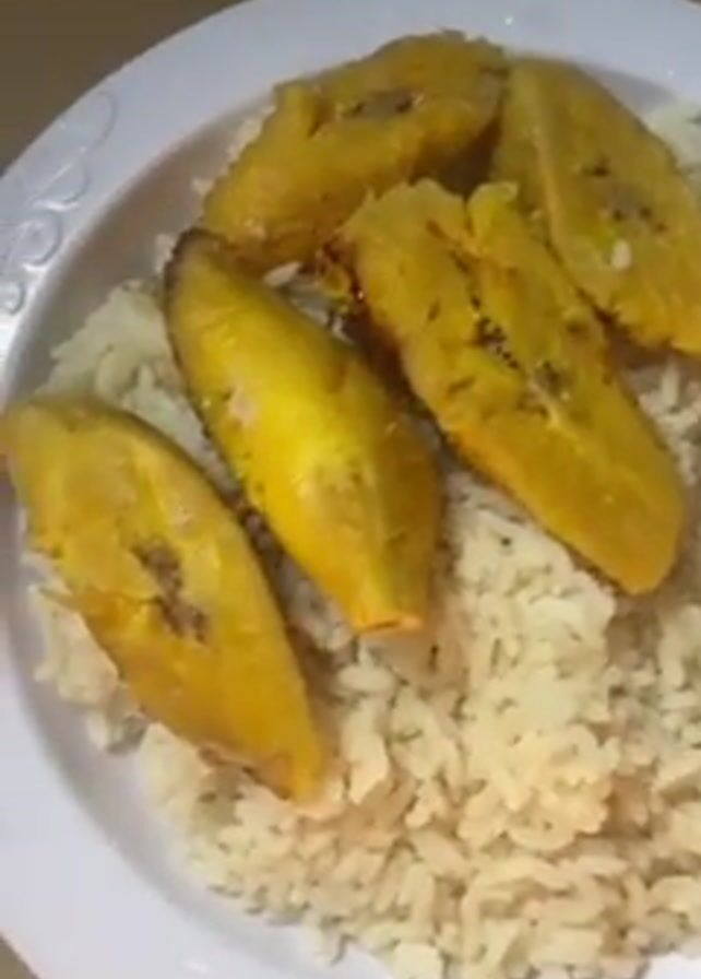 plate of food. On one side, there is a mound of rice with several fried plantains placed on top. Next to this is another plate containing a fish head covered in a red sauce. The food is presented on white plates. The environment appears to be indoors, possibly a kitchen or dining area.