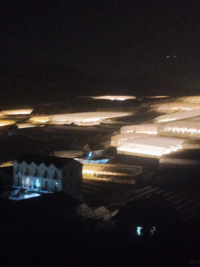 The image depicts an elevated, grainy, and somewhat blurred nighttime scene in Lạc Dương, Vietnam. In the lower-left foreground, a multi-story building with a light-colored facade, distinct arched windows, and a segmented roof is illuminated by bright, cool-toned (blue) lights, which reflect in a small body of water directly in front. Spreading across the midground and background, a vast array of large, elongated structures, consistent with agricultural greenhouses or poly-tunnels, are brightly lit from within by warm-toned (yellow) lights. The dark sky in the upper-right shows two faint, distant point-source lights. No individuals, specific actions, or interactions are discernible.