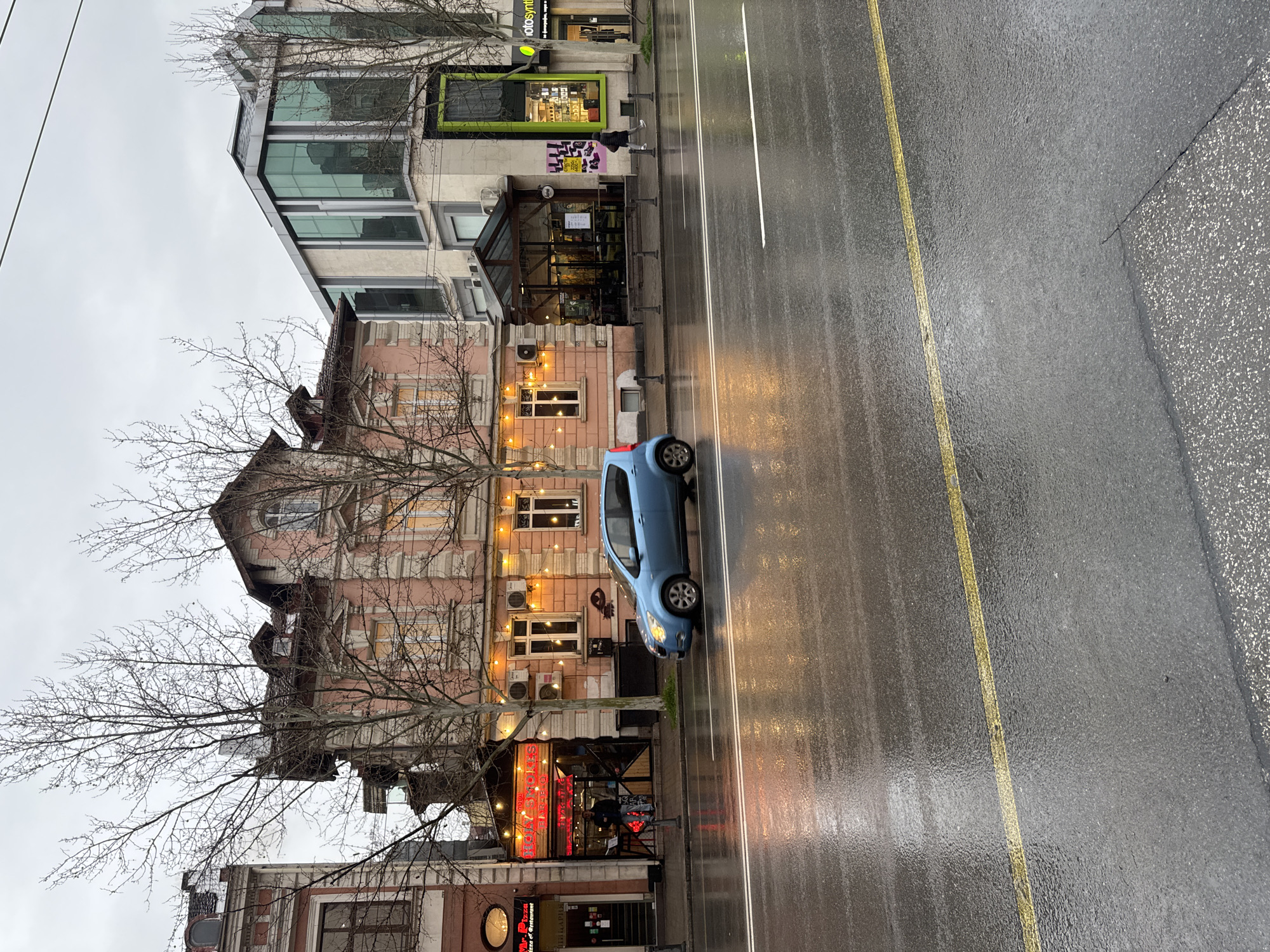 The image depicts a street scene in Sofia, Bulgaria, on a rainy day. A light blue car is parked along the sidewalk next to a row of buildings. The street is wet with reflections of the street lights and building lights. Buildings are diverse in architectural styles, including one with a pink facade decorated with lights and air conditioning units. A restaurant with red neon signage is visible at street level. Trees with bare branches line the street. The sky is overcast. There are pedestrian(s) visible but the picture quality makes it hard to describe them accurately.
