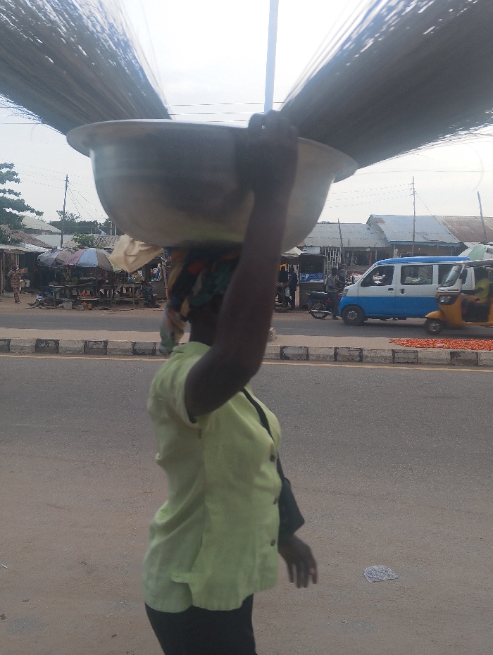 An adult female is depicted walking along a paved road in Zango-ndaji, Nigeria, carrying a large silver basin filled with numerous broom-like bundles on her head