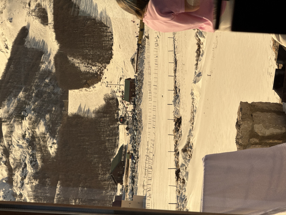 A high-angle outdoor scene, viewed through a window, depicts a snowy mountain landscape at a ski resort in Virak, Montenegro, under clear, sunny conditions with golden-hour lighting. In the immediate foreground, to the right, the back of a person's head and right shoulder are visible, indicating they are facing away from the camera and looking out. This individual wears a short-sleeved, light pink top. To the left, a light-colored textile, possibly a towel, hangs over an unseen object, below which a rough-hewn stone structure is partially visible. A dark, rectangular metal object is situated at the bottom center. The midground features an extensive, snow-covered field. Multiple parallel rows of dark, thin wooden or metal stakes protrude from the snow. A horizontal wire fence with dark posts traverses this field. Beyond the field, a large parking area is observed, containing numerous vehicles (cars and vans) partially covered in snow. Several buildings are present: a larger structure with a dark green roof and light-colored walls is prominent on the left, near the parking area. A smaller building with a red roof is located further right. Various smaller structures, including tents and equipment, are clustered at the base of the ski runs. Groups of people are actively present around these buildings and at the base of the slopes, engaged in winter sports activities. The background is dominated by a large, snow-covered mountain. Multiple ski slopes, both groomed and natural, descend the mountain. Dense, bare deciduous trees cover significant portions of the mountain, interspersed with snowy rock formations. Several ski lift towers and cables are visible, ascending the mountain, with some chairlifts carrying individuals. Long shadows are cast across the snow, indicating a low sun angle.