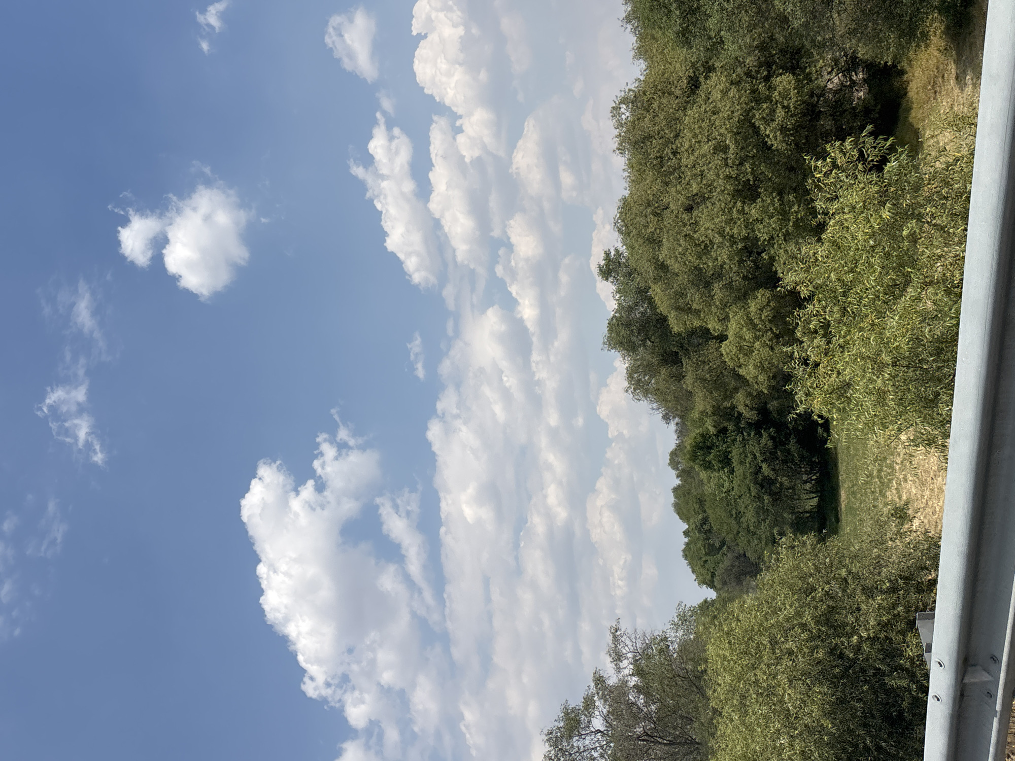 The image depicts an outdoor, daytime landscape located in Zacatelco, Mexico. The upper two-thirds of the frame consist of a clear blue sky interspersed with numerous white cumulus clouds of varying sizes and densities. The lower third of the image is dominated by dense, green vegetation, including a mix of trees and shrubs exhibiting diverse shades of green foliage. Patches of drier, light-brown ground are visible beneath the tree line in the mid-ground. A gray, metallic guardrail with visible bolts and structural elements occupies the immediate foreground, extending horizontally across the bottom edge of the frame. No people, animals, or specific activities are present in the scene.