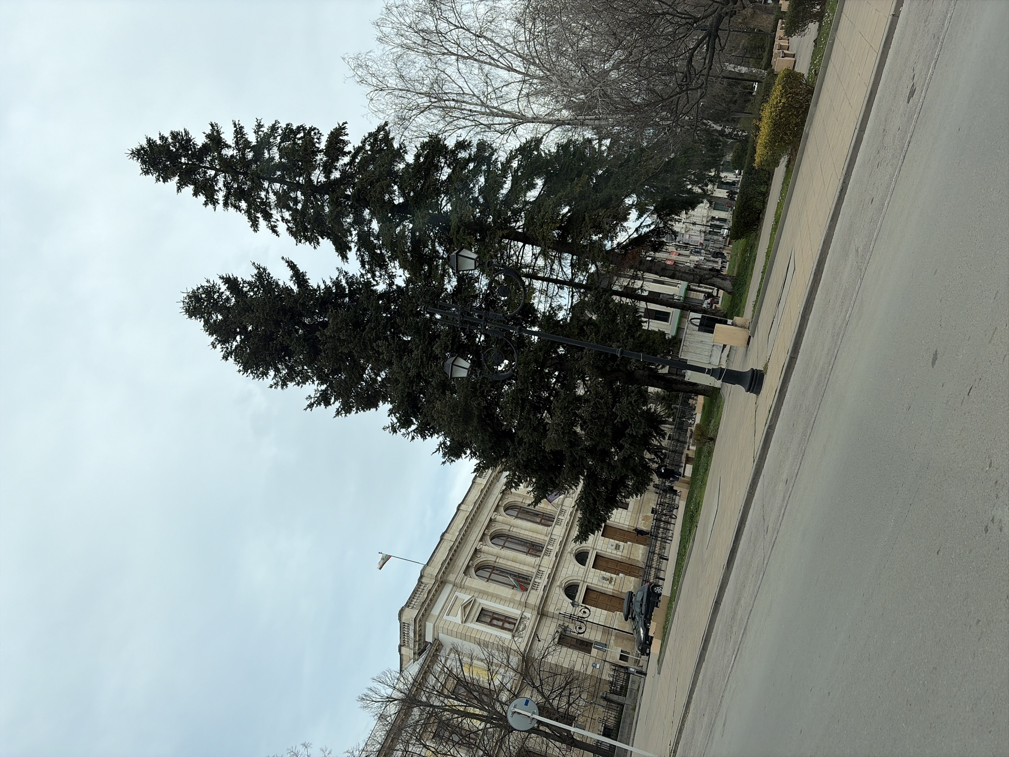 The image displays an urban street scene in Sofia, Bulgaria, specifically depicting the Rectorate of Sofia University "St. Kliment Ohridski" under an overcast sky. The foreground shows a grey asphalt road, leading to a paved sidewalk separated by a curb. To the left, the multi-story Rectorate building, a classical structure with light-colored facade, arched windows, and decorative elements, is prominently visible. The national flag of Bulgaria (white, green, red horizontal tricolor) flies from a pole on the building's roof, and a smaller Bulgarian flag is displayed from a window on the building's facade. A dark-colored hatchback or small SUV, equipped with a roof cargo box, is parked on the street in front of the university building. Two tall, dark green coniferous trees, likely firs or spruces, stand centrally in the midground, partially obscuring the building. A decorative black metal lamppost with two lanterns is positioned in front of these trees. To the right of the lamppost and trees, a park-like area features a paved path, green grass, shrubs, bare deciduous trees, benches, and bicycle racks. Several indistinct human figures are present on the sidewalks near the building and within the park area; their specific actions or interactions are not discernible due to distance. Another similar lamppost and additional buildings are visible further down the street on the right. The overall lighting is diffused, consistent with an overcast day.