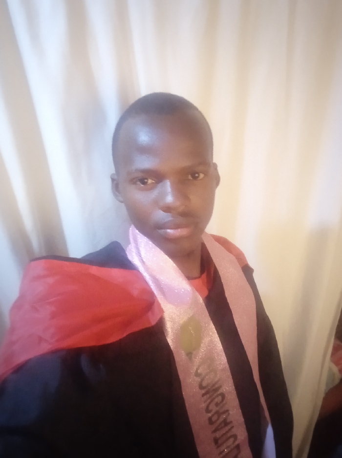 The image displays a head and torso shot of a single adult male, appearing to be of African ethnicity, facing directly towards the camera. He has short, dark, closely cropped hair and a neutral expression. He is dressed in what appears to be academic regalia, consisting of a black gown. Over this, a red garment or stole is draped across his shoulders and chest. A shimmering light pink sash is worn diagonally over his right shoulder and chest, bearing reversed text that reads "CONGRATULATIONS." A small, light-colored circular object, possibly a pin or badge, is attached to the pink sash near his right collarbone. The background is a uniform, light-colored (off-white or cream) curtain, indicating an indoor environment. No specific identifying features of the city of Embu, Kenya, are visible within the frame to pinpoint the precise location.