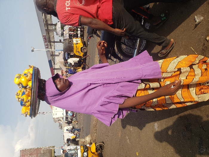 - "A woman carries a tray of yellow fruit on her head while standing in a street with vehicles and buildings in the background" by FM-Da03f1, licensed under CC BY 4.0