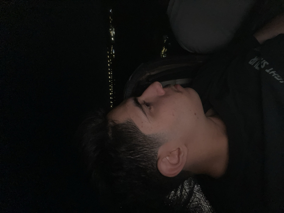 The image displays a nighttime scene within Dummar Municipality, Syria, featuring a young male in profile within what appears to be a vehicle or enclosed structure, looking out at a distant city illuminated by lights. The primary subject is a male with short, dark hair, facing towards the right side of the frame. He exhibits a prominent nose, a visible ear, and smooth skin. He is dressed in a dark, likely black, crew-neck t-shirt; faint light-colored text or a logo is discernible on the lower right portion of the garment. His gaze is directed towards the distant background. Illumination on his face originates from the left. To the left of his head, a reflective, textured material, possibly a metallic interior surface or a sunshade, is visible. An indistinct, dark shape, possibly another individual or a vehicle seat, is partially visible to his right. The background consists of a dark landscape dotted with numerous scattered points of light, indicative of an urban or suburban area at night. These lights, appearing yellow and white, are consistent with streetlights and building illumination, suggesting a panoramic view over a populated area.
